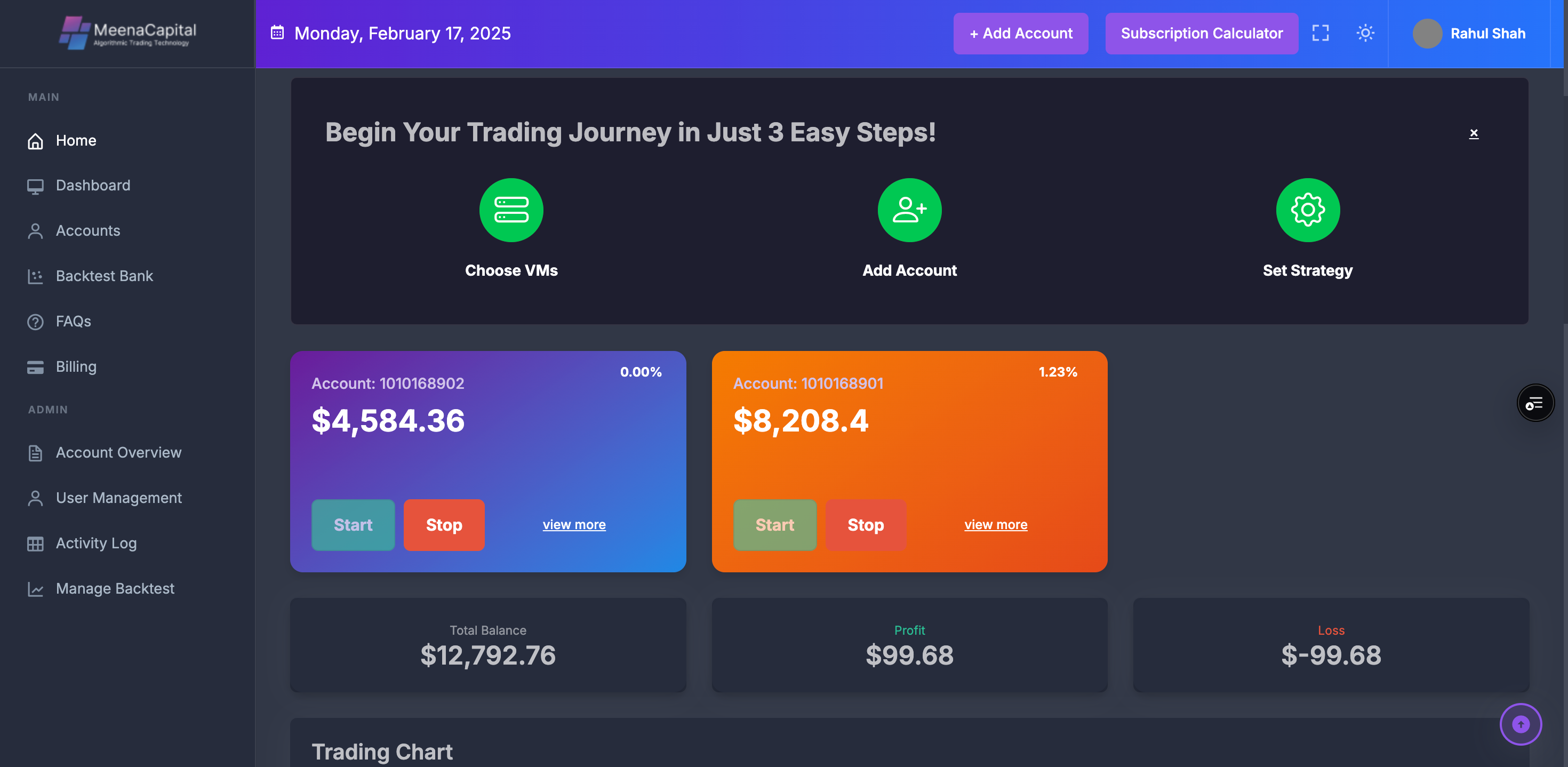 A precision-driven trading dashboard built for serious traders. Monitor multiple accounts, design custom strategies, and backtest with real market data.